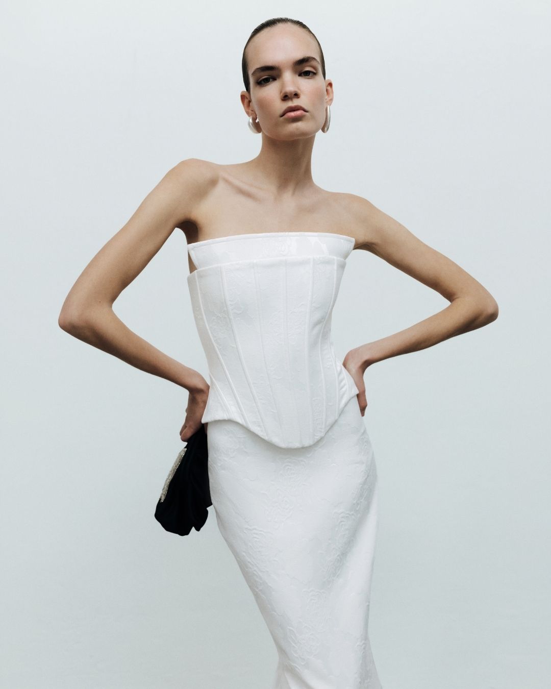 Miles-Strapless Lace Midi Dress With Back Train Detail