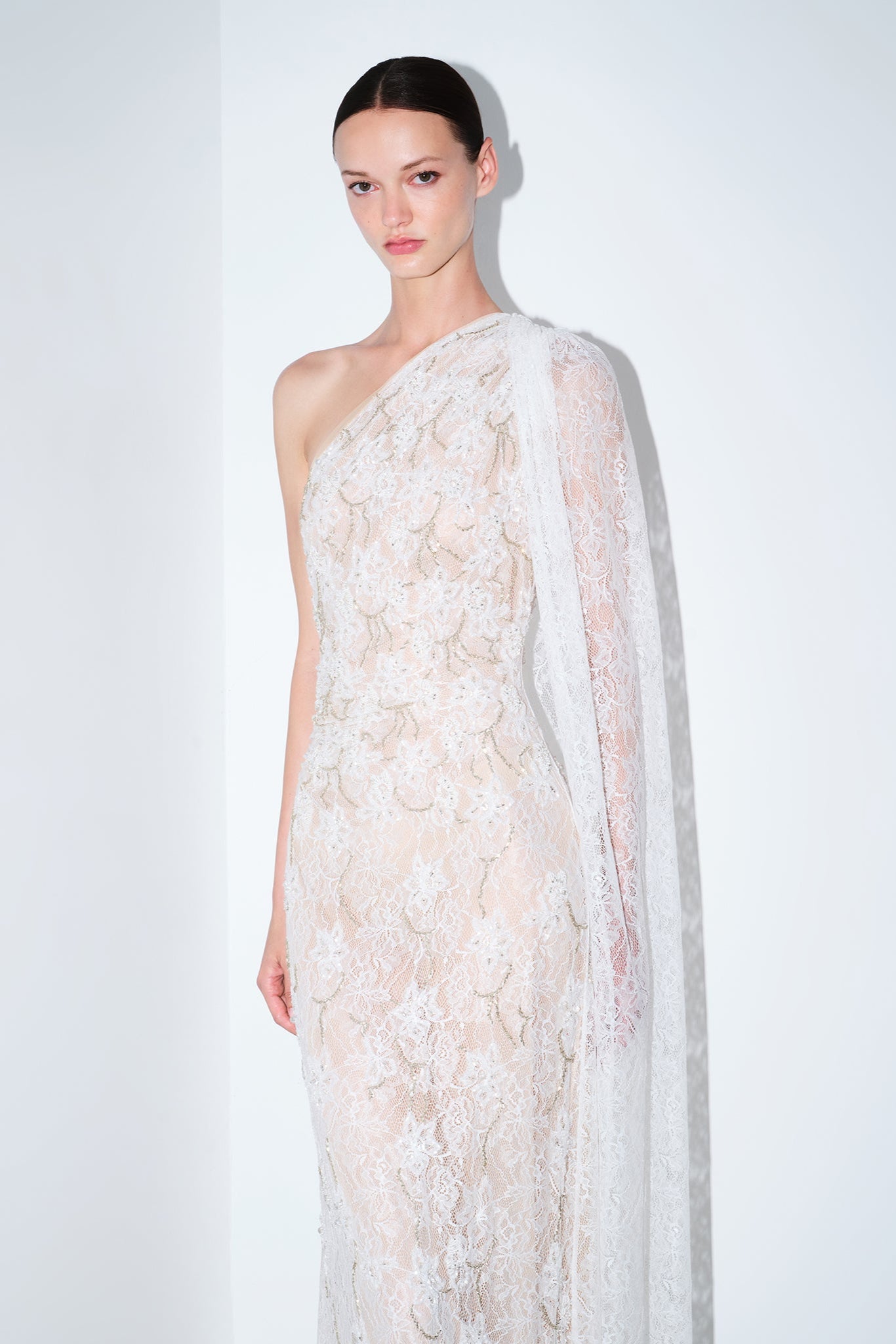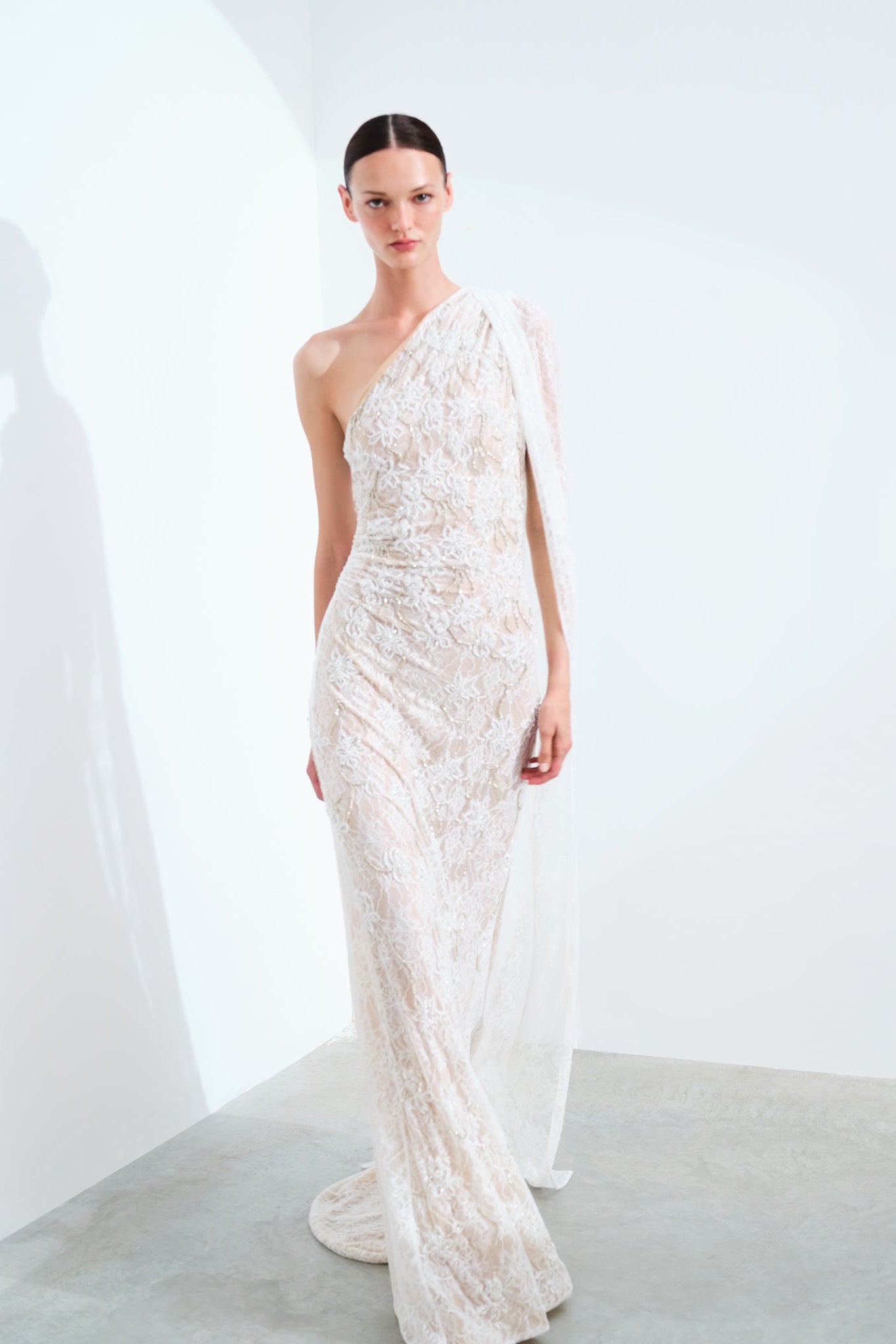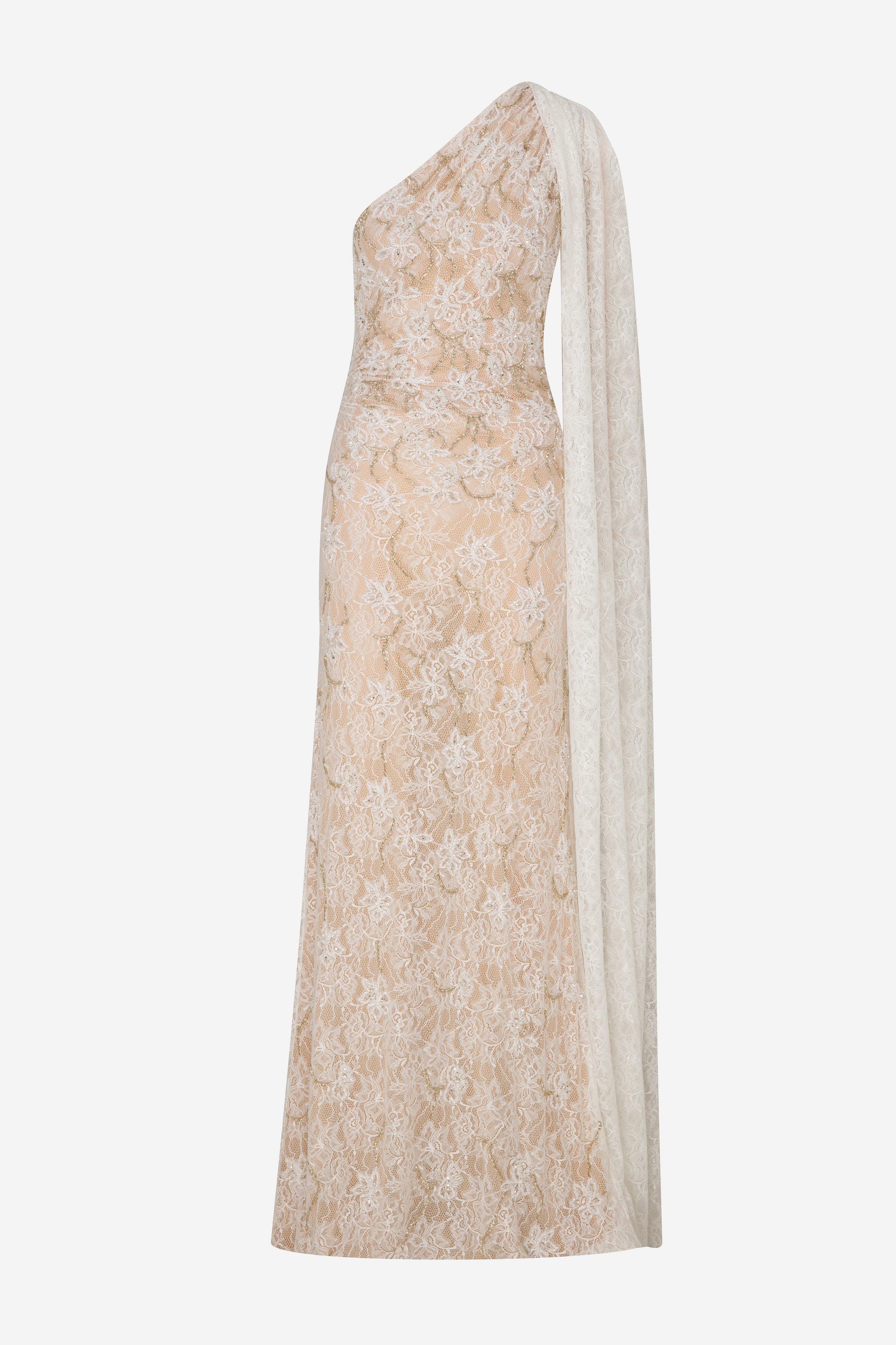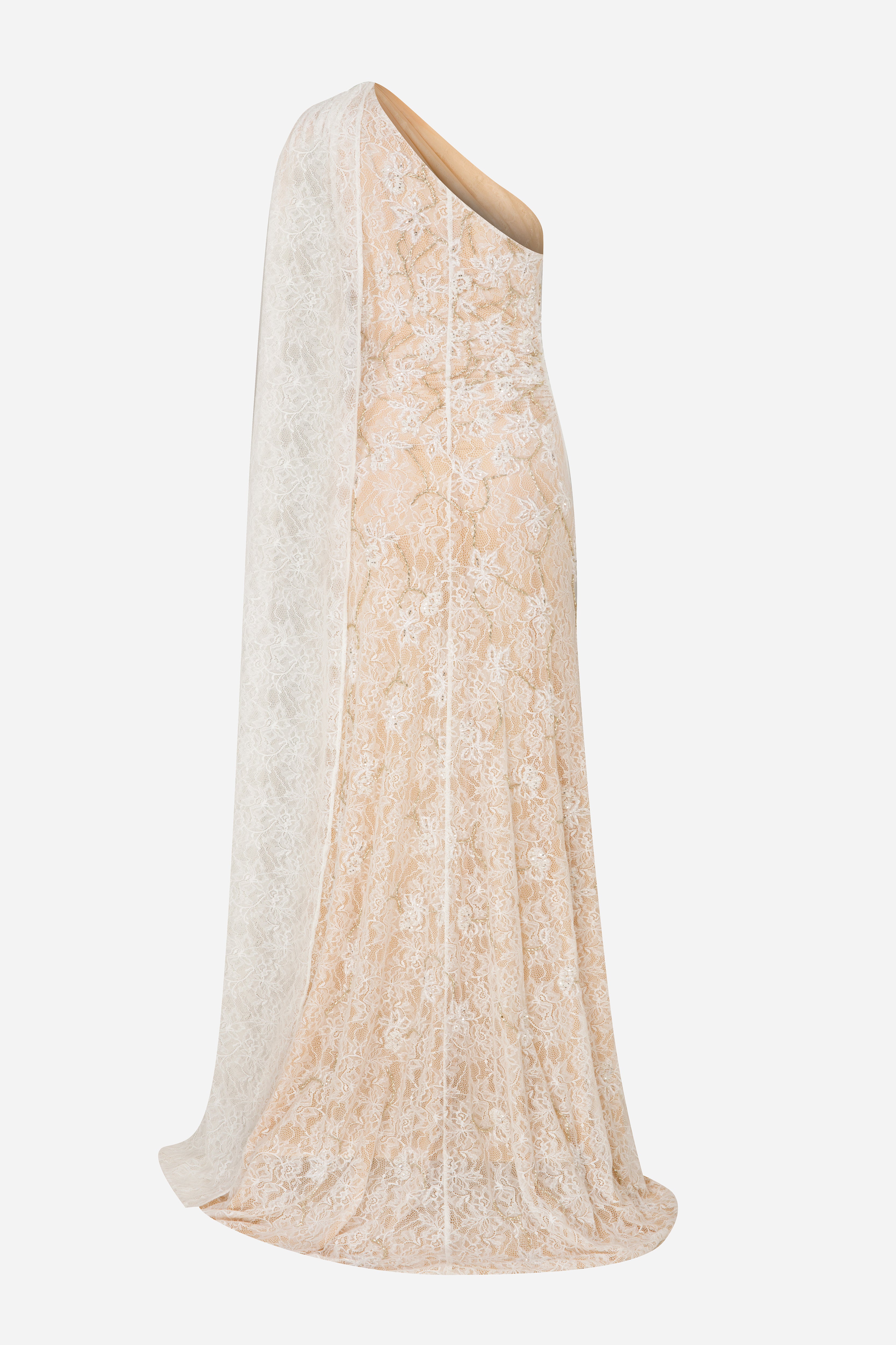 - Hand-Embroidered One Shoulder Lace Gown