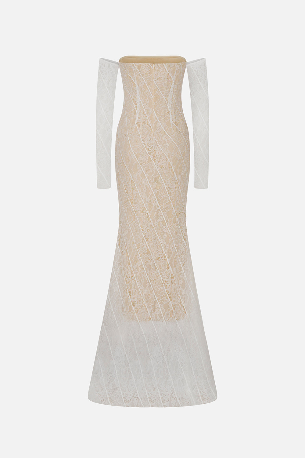 - Hand-Beaded Off-Shoulder Lace Maxi Dress With Inner Corset