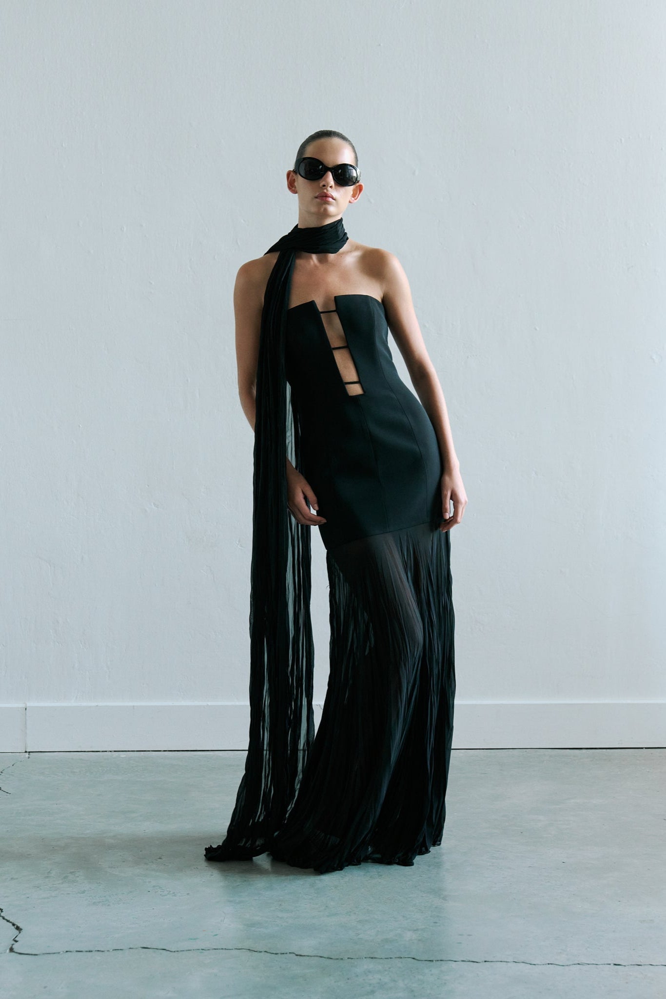 Laura - Strapless 3-String Dress with Crushed Chiffon Detailed in Black