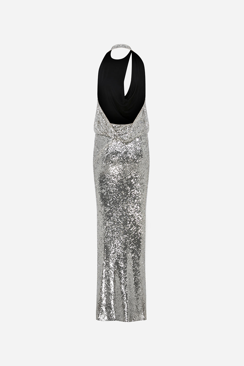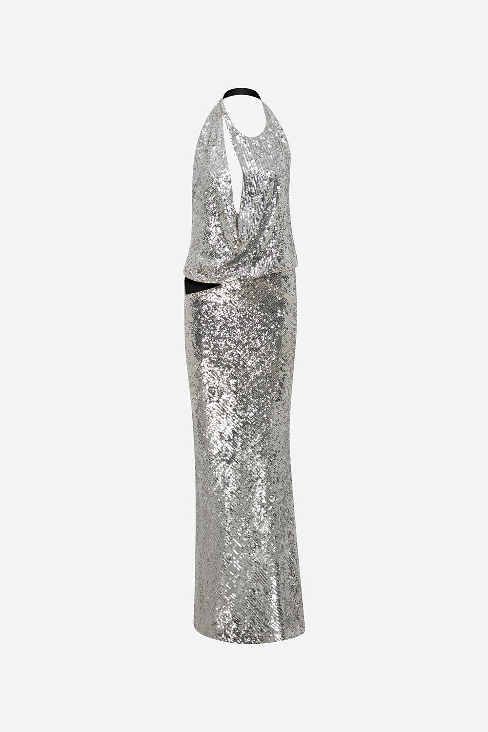 Lone - Cowl Neck Cut Out Detailed Silver Sequin Maxi Dress