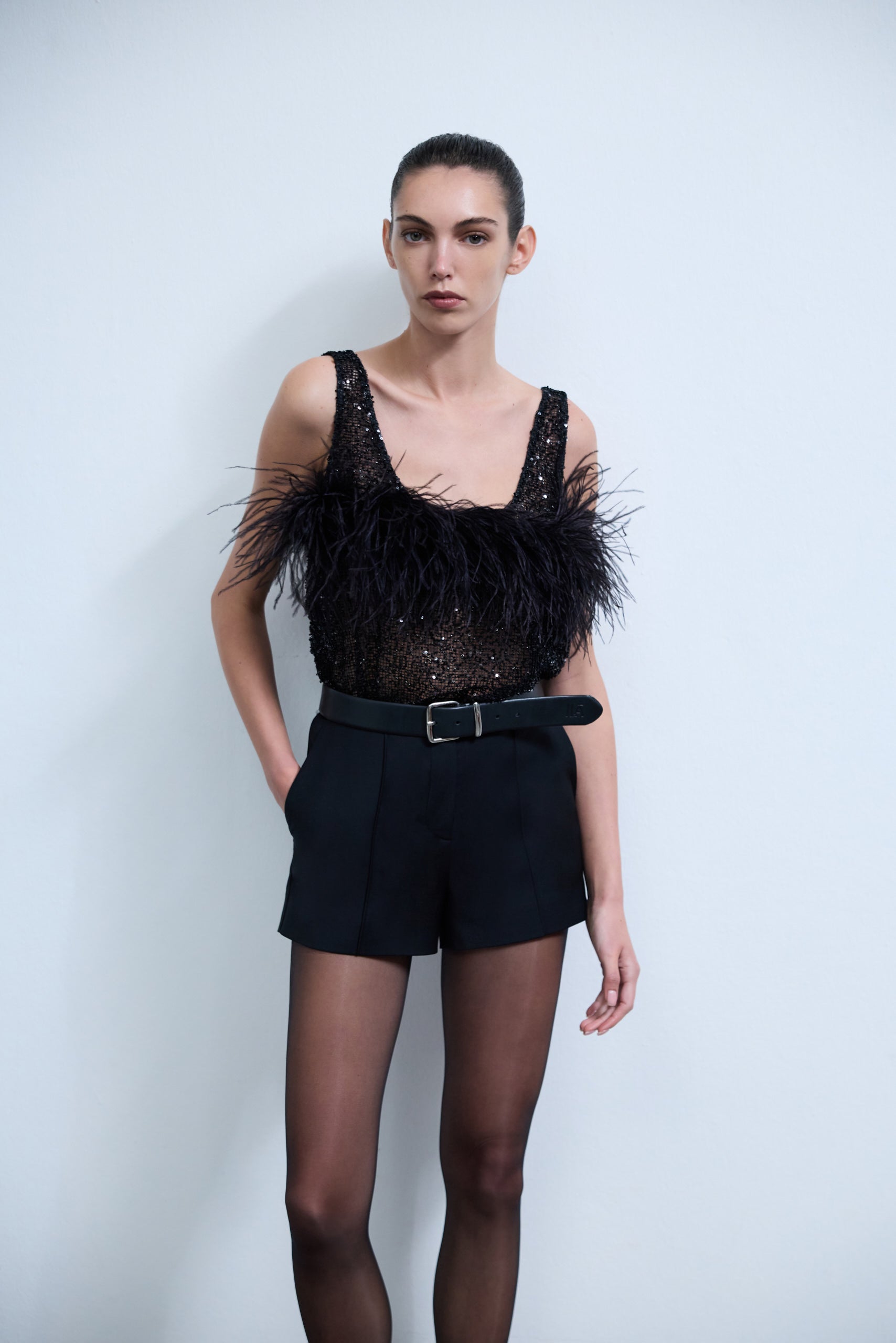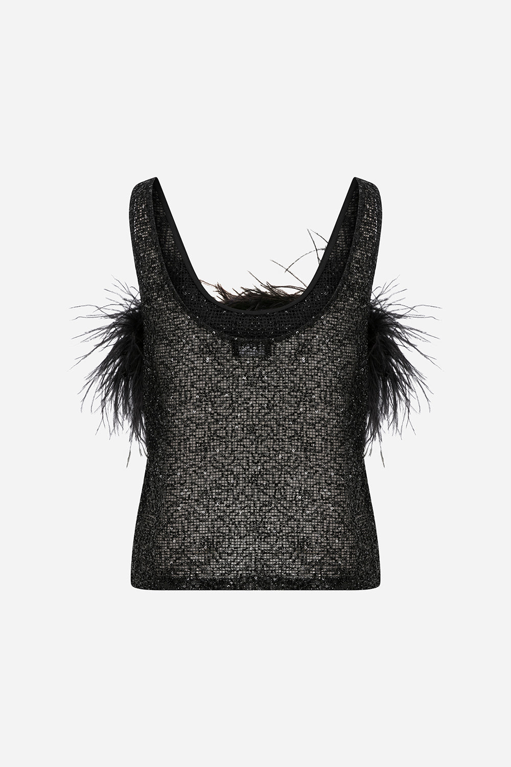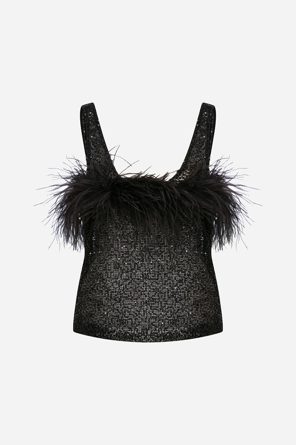Reve - Ostrich Feather Detailed Sequin Top in Black