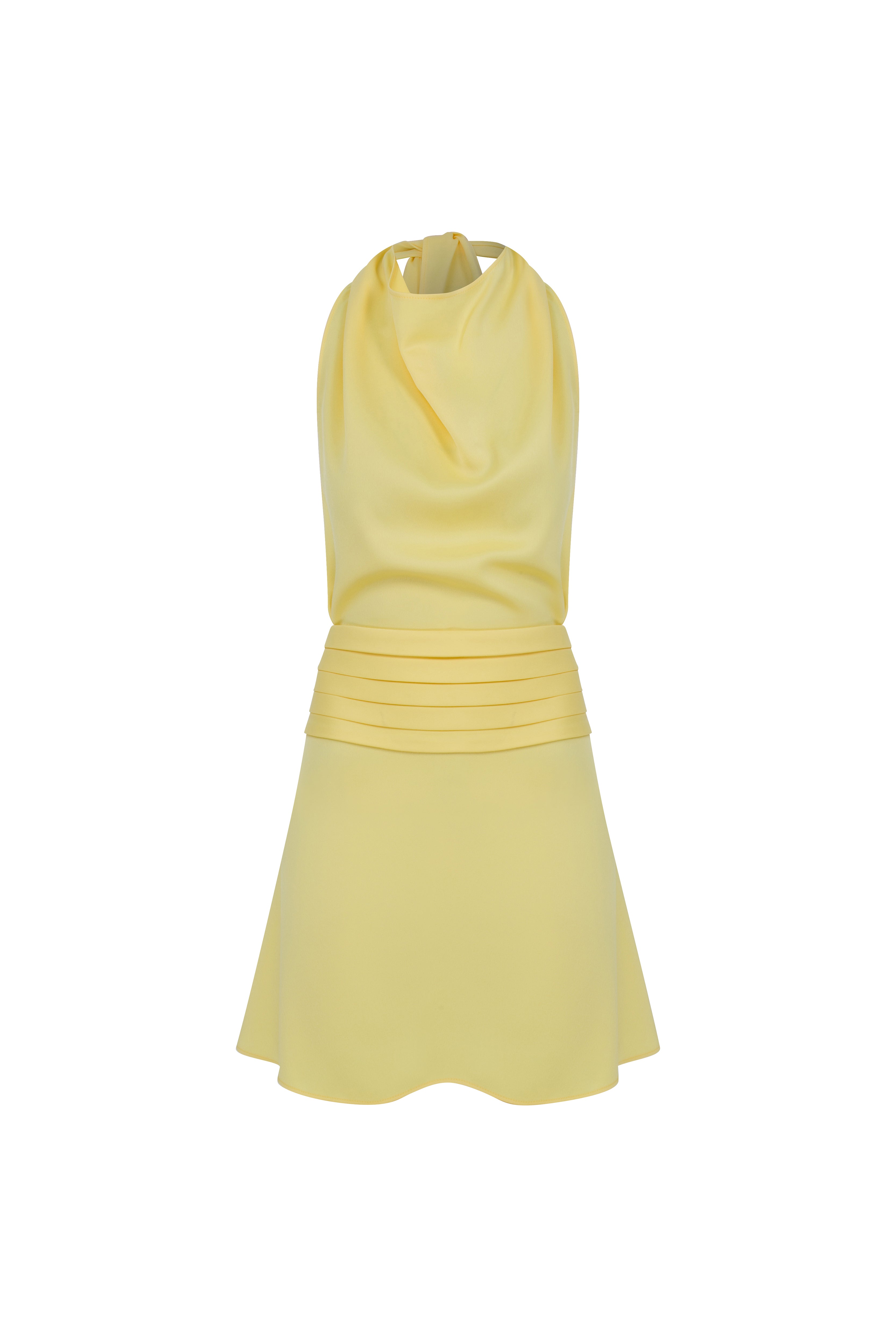 Monica - Draped High Neck Bias Cut Satin Mini Dress in Yellow