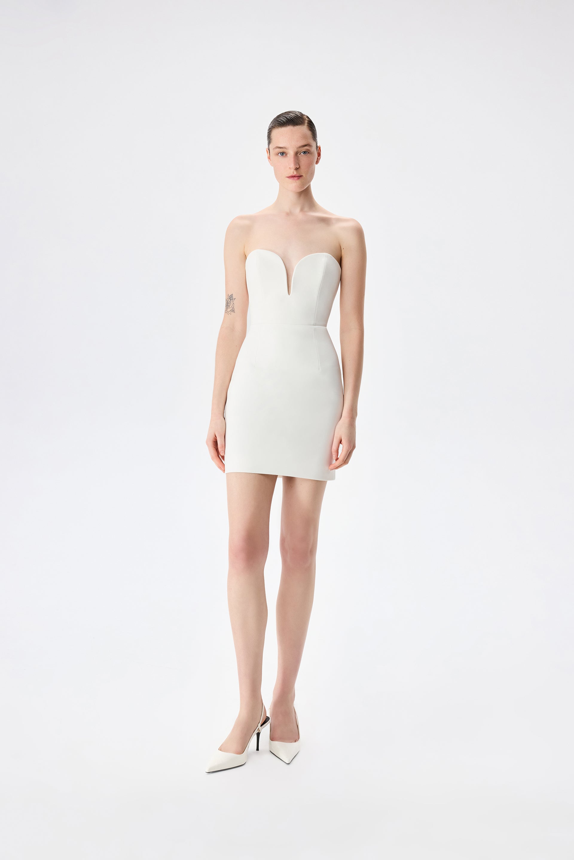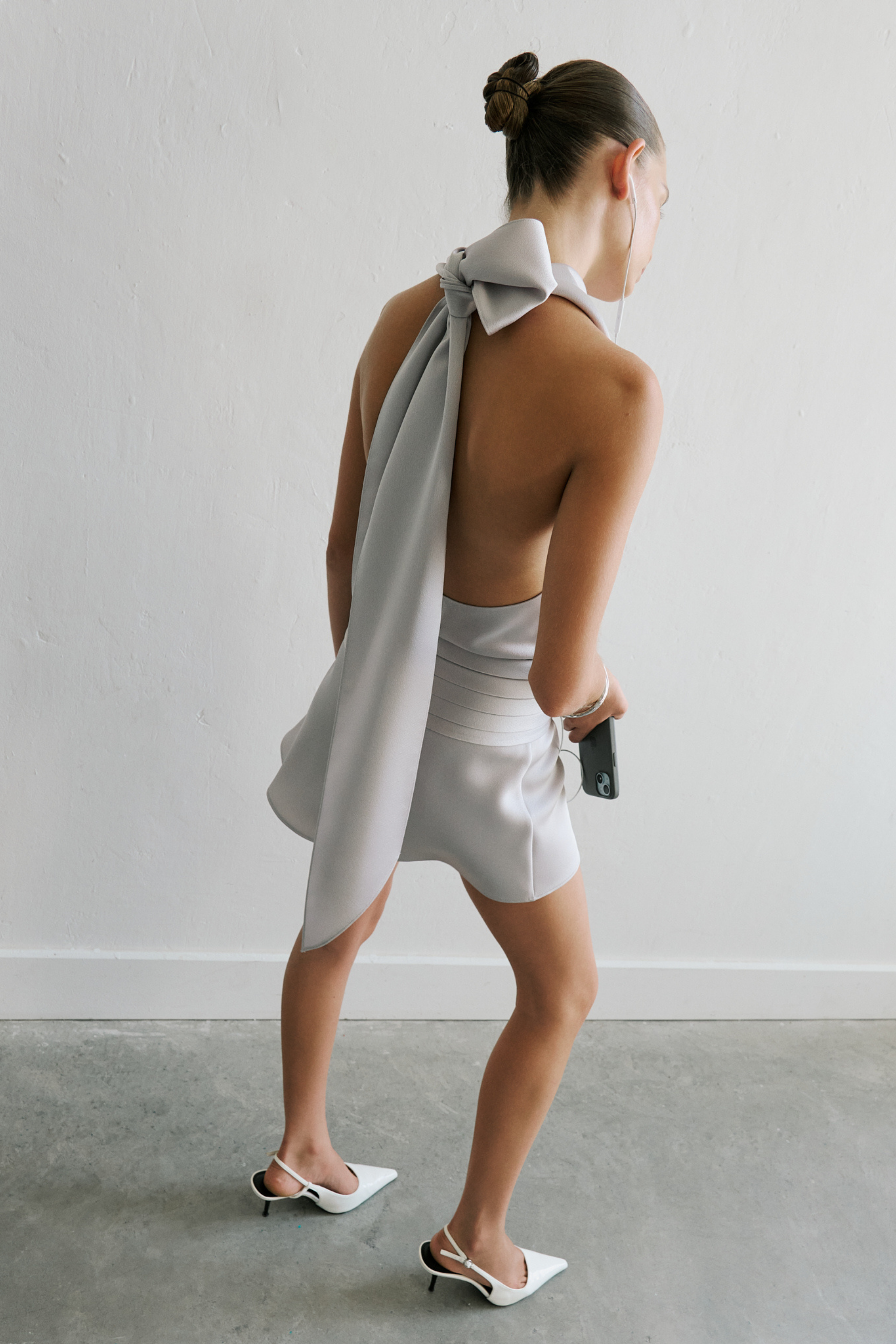 Monica - Draped High Neck Bias Cut Satin Mini Dress in Silver