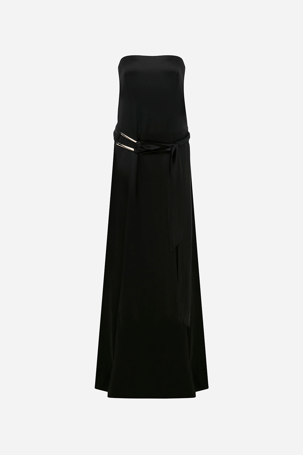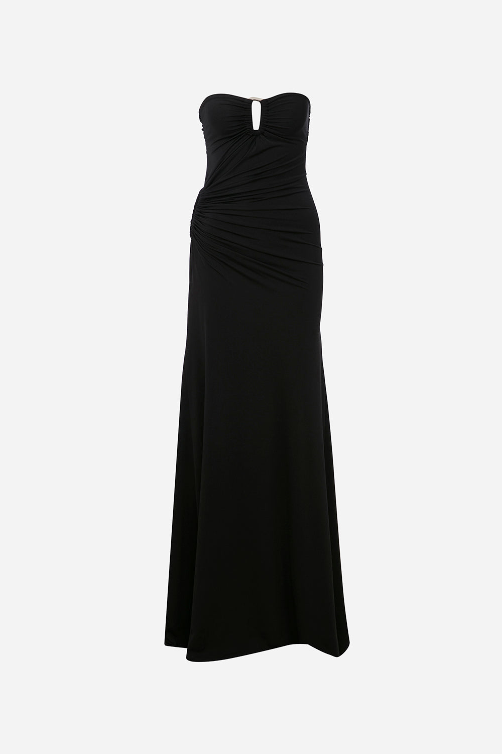 Clara-Strapless Jersey Maxi Dress With Ruhed Tail And Multiple Buckle Details in Black