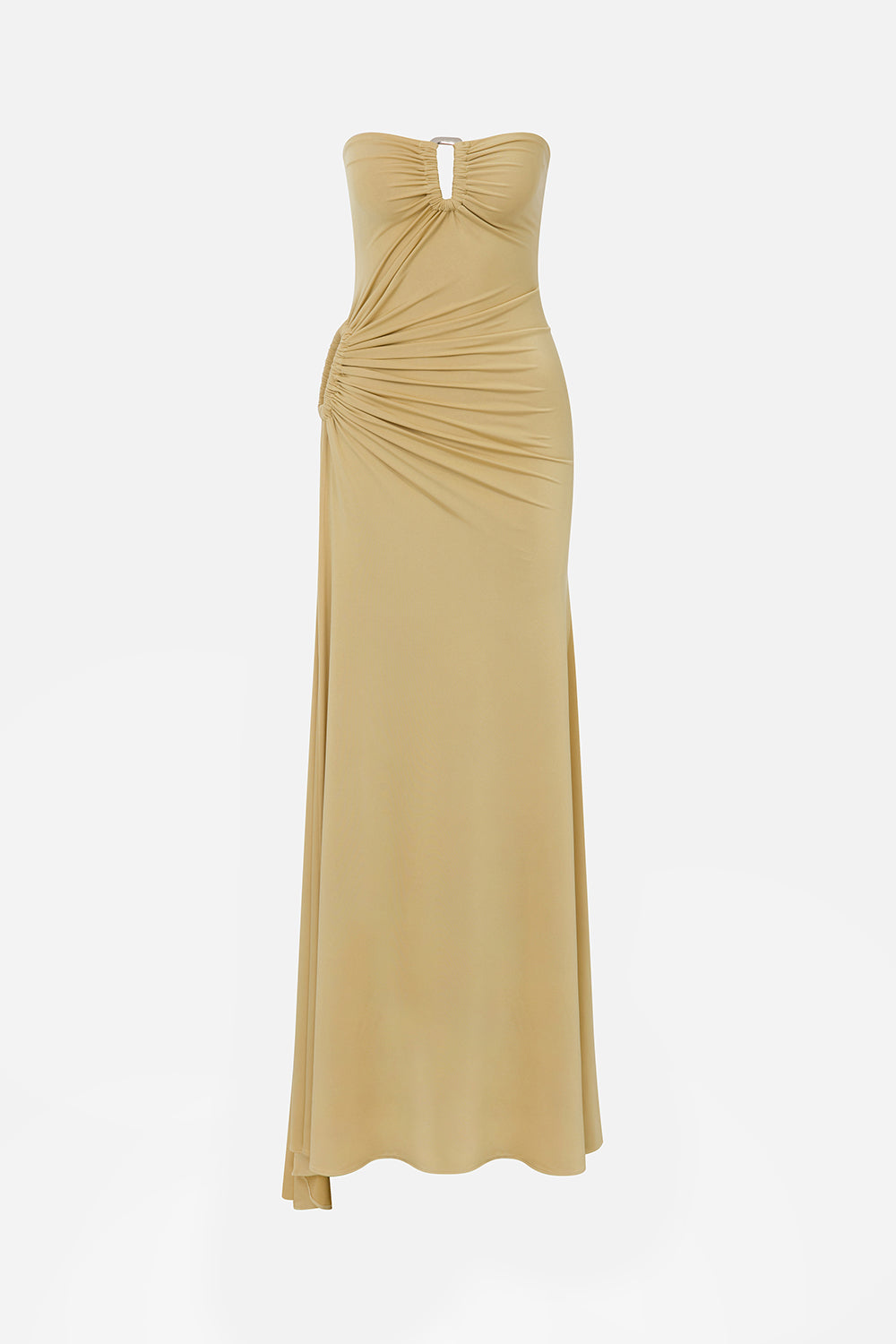 Clara-Strapless Jersey Maxi Dress With Ruhed Tail And Multiple Buckle Details in Yellow